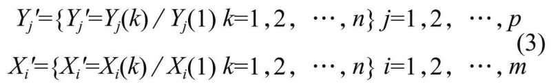 ②Y和X的無量綱處理。在分析之前,先對各指標值歸一化處理,采用初值化處理,即序列中的所有數據均與它的第一個數據相除,從而得到一個新序列?;疑P聯(lián)分析無量綱處理后的參考序列Yj’和比較序列Xi’如式(3)所示。