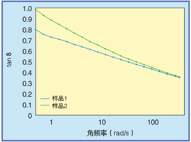 圖6、從頻率掃描數(shù)據(jù)顯示tanδ作為樣品 1和樣品2角頻率的函數(shù);在低角頻率下觀察到試樣粘彈性響應(yīng)的顯著差異, 與高分子結(jié)構(gòu)相關(guān);樣品 1顯示了一個較低的tanδ值, 表明具較高的彈性