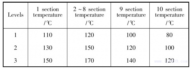 2.2.3 正交實驗設(shè):正交實驗是一種高效、快速、經(jīng)濟的實驗設(shè)計方法,其結(jié)果具有試驗次數(shù)少、試驗點分布合理、試驗結(jié)果信息量大,結(jié)果分析具有統(tǒng)計性質(zhì)等優(yōu)點。本文設(shè)計三水平三因素的正交實驗,探究主機螺桿轉(zhuǎn)速、超臨界流體與膠粉質(zhì)量比,以及機筒溫度 排布對廢舊橡膠再生效果影響的強度。試驗因素水平表如Tab. 3所示。
