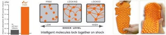 沖擊吸收D3O與聚氨酯-PU(左),D3O的網(wǎng)狀吸收機制(中),D3O能量吸收保護織物墊(右)