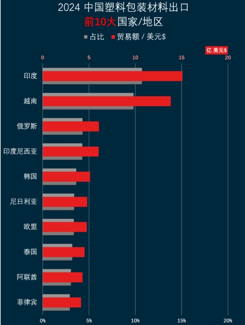印度是中國塑料包裝材料出口的第一大目的地國家/地區(qū)。2024年,中國向印度出口了15.1 億美元,超過全年中國塑料包裝材料總出口額的1成 (10.7%)。