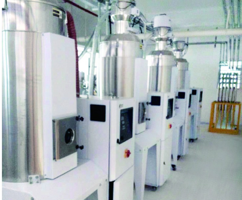 湖北某汽車內(nèi)飾有限公司專業(yè)從事開發(fā)、生產(chǎn)、銷售汽車內(nèi)、外及發(fā)動機(jī)艙塑料零部件,包括:門護(hù)板、儀表板、保險(xiǎn)杠、擾流板等。該公司共有含4臺雙色機(jī)在內(nèi)的19臺注塑機(jī),主要原料為ABS、PMMA,總用量約1950kg/hr,全部需要干燥,雙色機(jī)原料需要除濕,按客戶的需求我們?yōu)槠渑鋫淞?3臺干燥機(jī)設(shè)備。